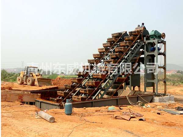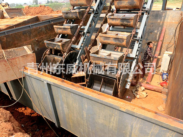 挖斗洗砂機(jī)工作時(shí),電機(jī)通過三角帶、減速機(jī)、齒輪減速后帶動(dòng)上料機(jī),均勻給料到滾篩進(jìn)行篩分,合格產(chǎn)品經(jīng)過溜槽進(jìn)入洗槽中,此時(shí)鏈斗裝置的動(dòng)力系統(tǒng)帶動(dòng)四角輪緩慢轉(zhuǎn)動(dòng),在鏈斗的帶動(dòng)下翻滾,并互相研磨,除去覆蓋砂石表面的雜質(zhì),同時(shí)破壞包覆砂粒的水汽層,以利于脫水;同時(shí)加水,形成強(qiáng)大水流,及時(shí)將雜質(zhì)及比重小的異物帶走,并從溢出口排出,完成清洗作用。干凈的砂石由挖斗提起,砂石從上四角輪倒入出料槽,完成砂石的清洗作用。