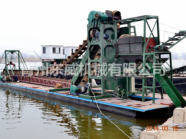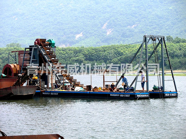 鏈斗式挖沙船可根據(jù)客戶性能要求及工礦作業(yè)特點設計制造。物料挖掘出來并由輸送機或輸送泵輸送至岸邊、運沙船的功能;浮體采用橫骨架式分體箱形結(jié)構(gòu),轉(zhuǎn)運時可拆裝后裝車。裝有定位設備、鏈斗挖掘裝置、橋架升降裝置及皮帶輸送機等。水下桿是由安裝在浮體上的絞車實現(xiàn)升降,砂石料通過鏈斗裝置挖掘上來,由輸送機或輸送泵輸送到岸上或運沙船。