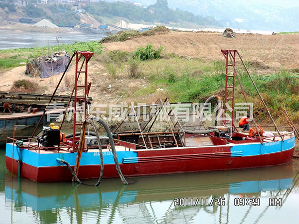 該抽沙設(shè)備主要適用于水庫、河道、湖泊等寬車輛不能進(jìn)入的闊水域作業(yè),工作流程為抽沙運(yùn)輸船開到抽沙區(qū)域,利用抽沙船自帶的抽砂系統(tǒng)將沙子抽進(jìn)船艙,抽滿船艙后運(yùn)輸至岸邊,打開底艙門,將沙子卸到水里,再用岸邊的小型抽沙機(jī)抽出并輸送至碼頭或者直接用抽砂泵講沙子從船艙輸送至碼頭。該設(shè)備結(jié)構(gòu)簡(jiǎn)單、工作量大、易損件少,抽出來的沙子含泥量低,無石塊,沙子質(zhì)量好,是近幾年采沙、清淤比較常用的工具。