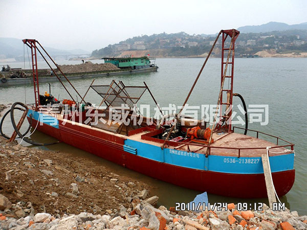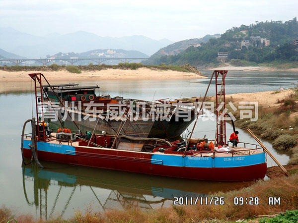 該抽沙設(shè)備主要適用于水庫、河道、湖泊等寬車輛不能進(jìn)入的闊水域作業(yè),工作流程為抽沙運輸船開到抽沙區(qū)域,利用抽沙船自帶的抽砂系統(tǒng)將沙子抽進(jìn)船艙,抽滿船艙后運輸至岸邊,打開底艙門,將沙子卸到水里,再用岸邊的小型抽沙機(jī)抽出并輸送至碼頭或者直接用抽砂泵講沙子從船艙輸送至碼頭。該設(shè)備結(jié)構(gòu)簡單、工作量大、易損件少,抽出來的沙子含泥量低,無石塊,沙子質(zhì)量好,是近幾年采沙、清淤比較常用的工具。